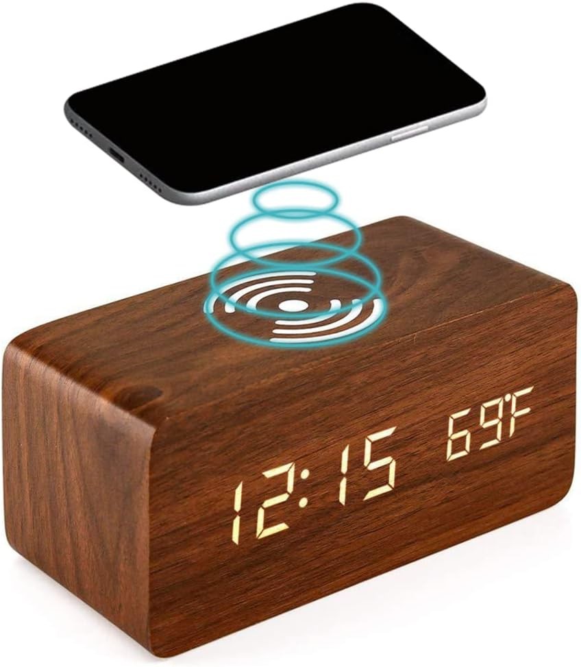 Wooden Digital Alarm Clock with Wireless Charging 3 Alarms Electronic LED Deskt