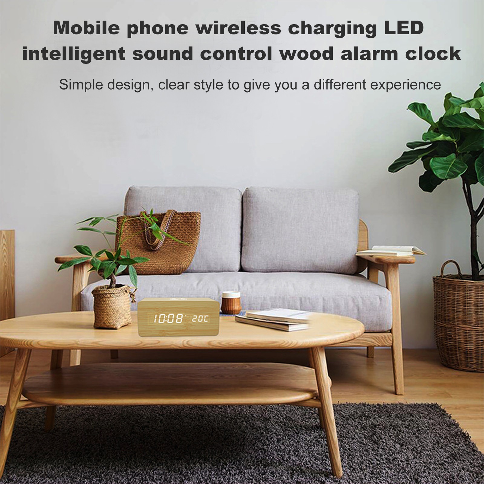 Wooden Digital Alarm Clock with Wireless Charging Brightness Volume Bedroom LED