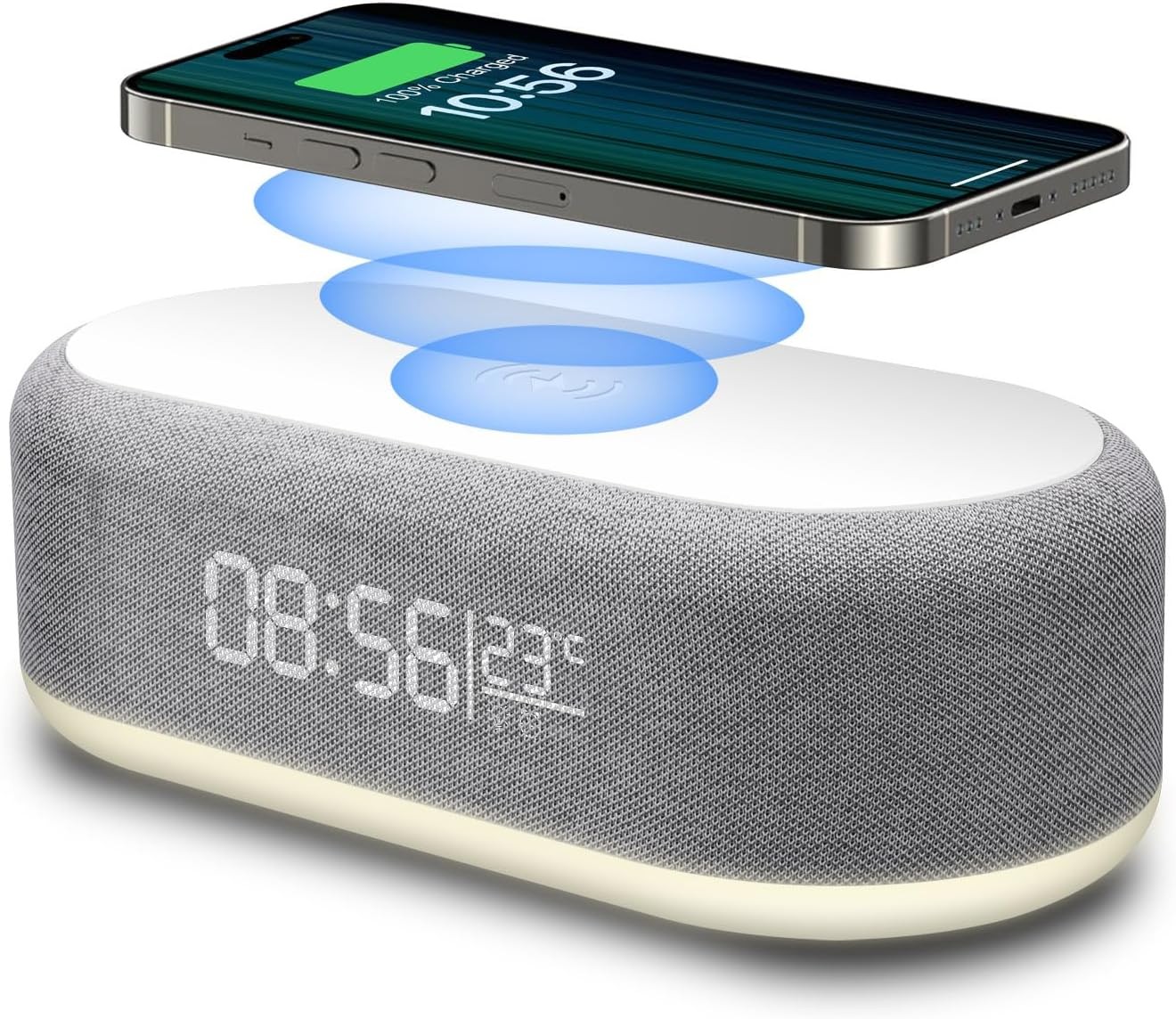 i-box Alarm Clocks Bedside, Alarm Clock with Wireless Charging, Bluetooth Speaker, FM Radio, Qi Wireless Charger, White Noise Machine, Night Light/Mood Light, USB Port, Dimmable, Non Ticking