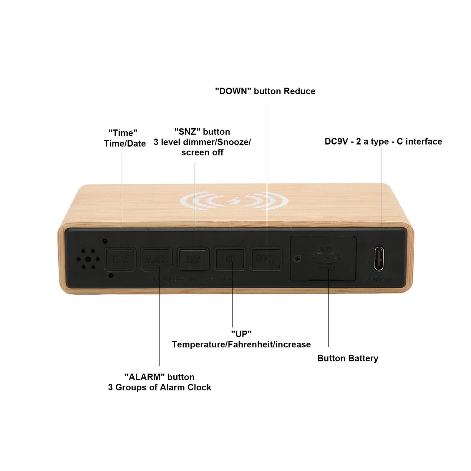 Wooden Digital Alarm Clock With Wireless Charging 3 Level Dimmer Wood LED Di BLW