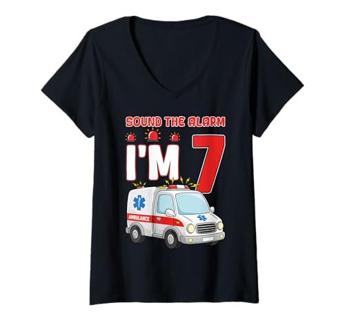 Women's Sound The Alarm I'm 7 Years Old Birthday Kid Ambulance V-Neck T-Shirt
