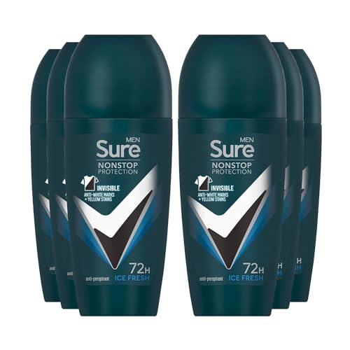Sure Antiperspirant 72H Nonstop Sweat and Odour Protection Alcohol-Free Roll On with Citrusy, Spicy and Woody Scent Multi Fragrance Deodorant for Men, 50ml Pack of 6 (Ice Fresh)