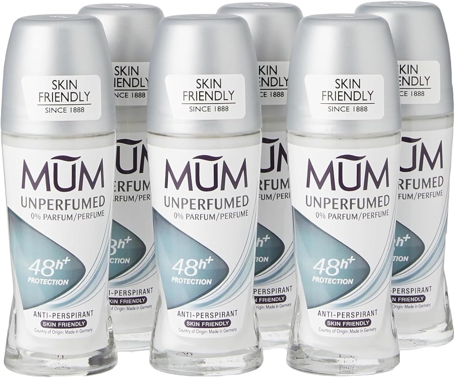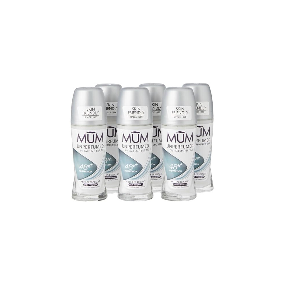Mum Unperfumed Roll On Deodorant, 48 Hours Plus Protection, Alcohol Free Womens Mens Deodorant, Anti-Perspirant, Vegan, Sustainable Glass Bottle, Fragrance Free, 50 ml, Pack of 6