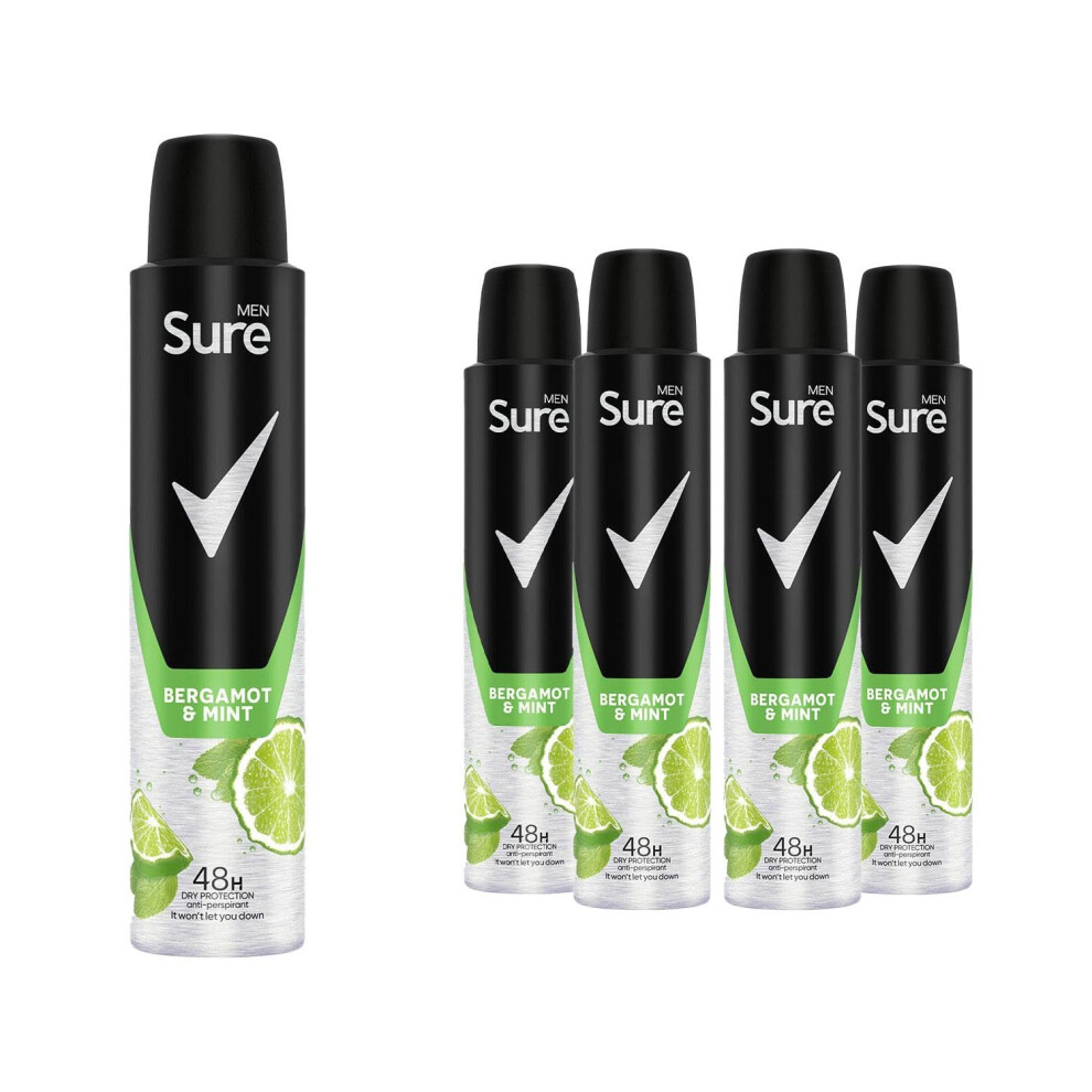 Sure Men Anti Perspirant Deodorant Bergamot & Mint, Pack of 5, Alcohol Free Deodorant Spray for Men with energising scent Provides 48-Hour Odour