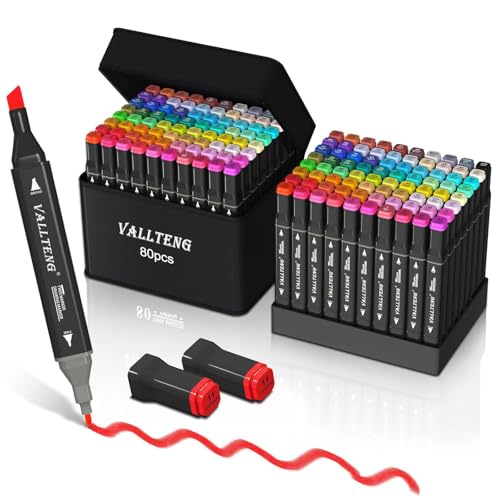 Vallteng 80 Colored Alcohol Based Markers, Quick-Drying Colouring Pens for Adults, Kids,Beginners, Dual Tip Permanent Art Marker Pens for Drawing, Sketching, Anime, Manga With Carrying Case and Base