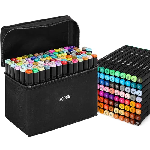 Alcohol Markers with Dual Tip - 80 Colors, Permanent Art Pens for Drawing, Sketching, Manga, Anime Design