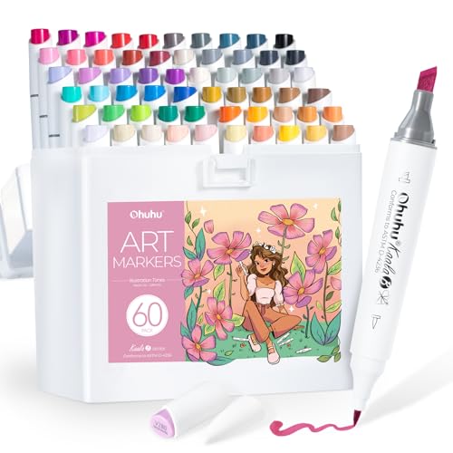 Ohuhu Alcohol Markers, 60 +1 Colours Brush & Slim Broad Dual Tips Seamless Blending Refillable Ink Permanent Art Markers for Artists Adults Colouring Calligraphy Drawing Illustration - Kaala B Serie