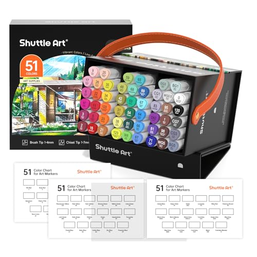 Shuttle Art 51 Colours Alcohol Markers Brush Tip, Dual Tip Art Pens and Colourless Blender, Brush & Chisel Felt Tip Pens with Case for Artists Adult Illustration Colouring Sketching Drawing