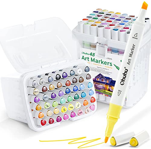 Ohuhu 48 Colours Alcohol Brush Markers, Double Tipped (Brush & Fine Tip) Sketch Markers, Artist Art Markers for Adult Coloring and Illustration, Bonus 1 Blender