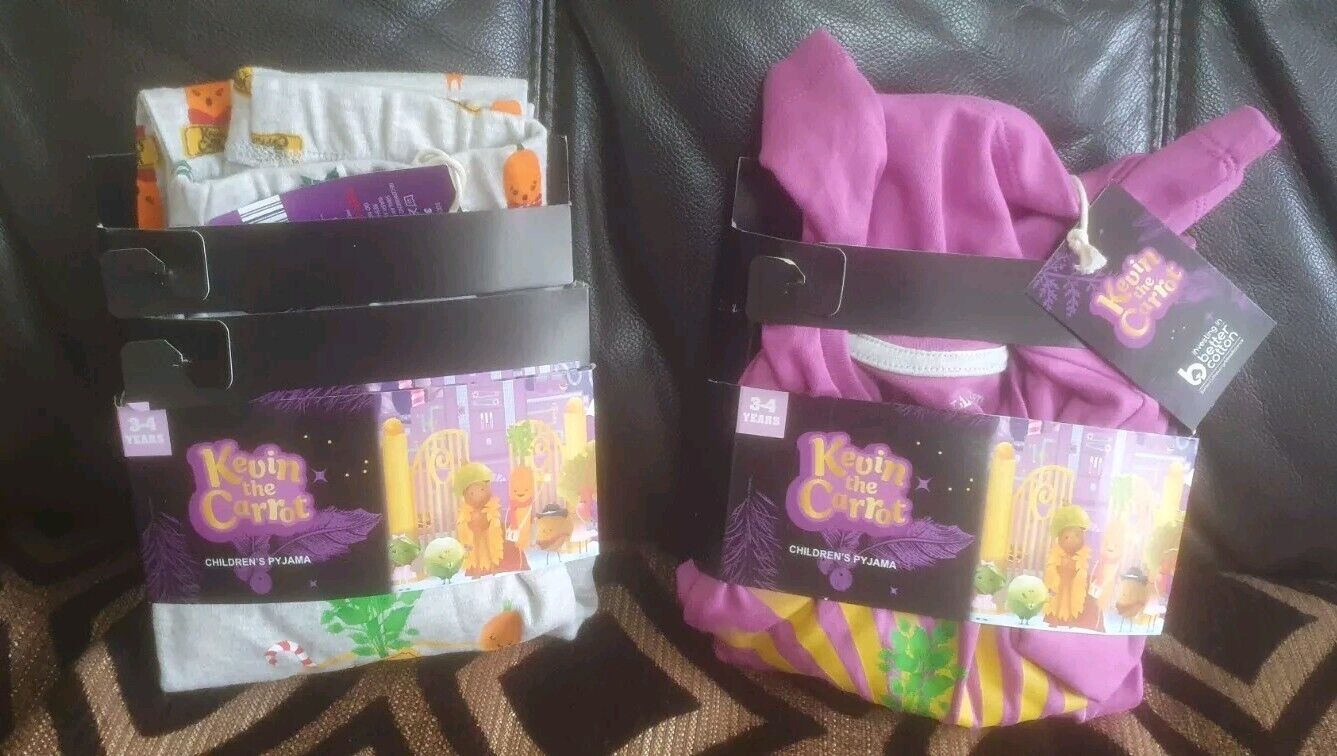2 X Bn Kevin The Carrot Children's Pyjama PJ’s Boys Girls 3-4 Years Grey Purple