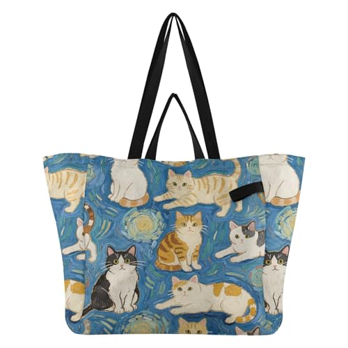 Blue Cat Art Painting Canvas Totes Waterproof Kitchen Grocery Bags Shopping Tote Bag for Women Travel Beach Party Bolsa aldo para Mujer