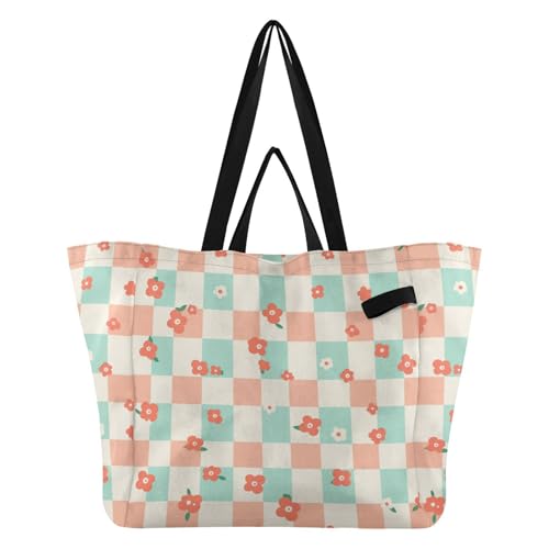 Mint Green and Coral Checkered Pattern Flowers Large Tote Bags Trendy Kitchen Grocery Bags Beach Bag for Women Spa Shower Necessities Bolsa aldo para Mujer