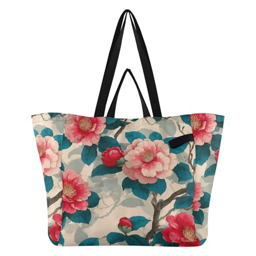 Ukiyo-e-Style Camellia Sky Blue Red Canvas Tote Bags Reusable Kitchen Grocery Bags Momlife Tote for Men Farmers Market, Travel Bolsa aldo para Mujer