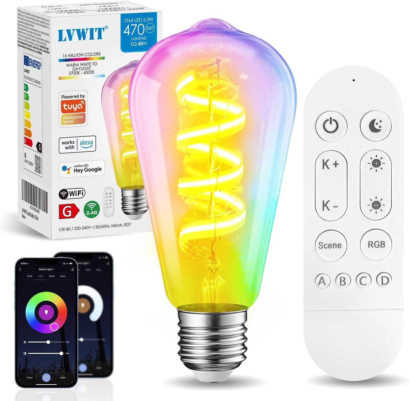 LVWIT E27 Smart Filament Bulb,Alexa Dimmable LED Color Changing Light Bulb,ST64