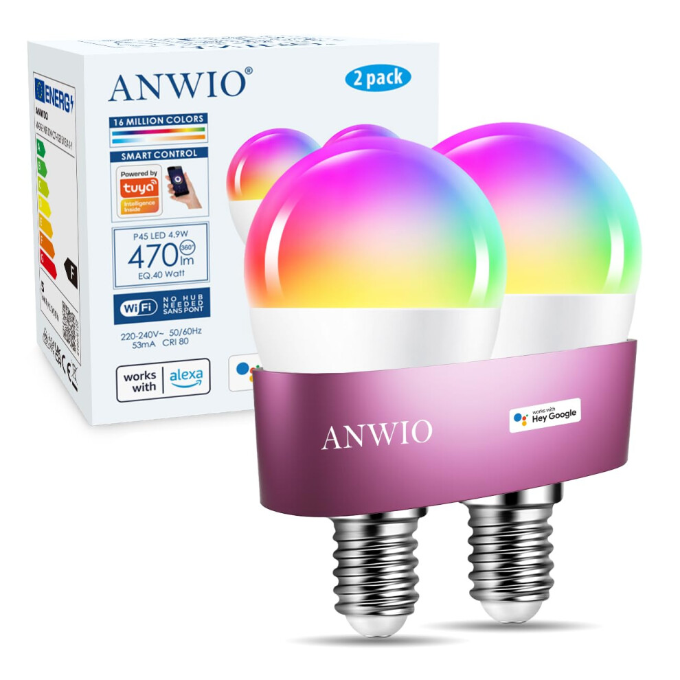 ANWIO Smart Bulb E14 Alexa Light Bulbs,RGB Colour Changing Bulbs,Smart Life App Control,Bluetooth & WiFi Bulb,470LM, 5W Replace 40 Watt,Works with Alexa & Google Assistant (2 Pack)