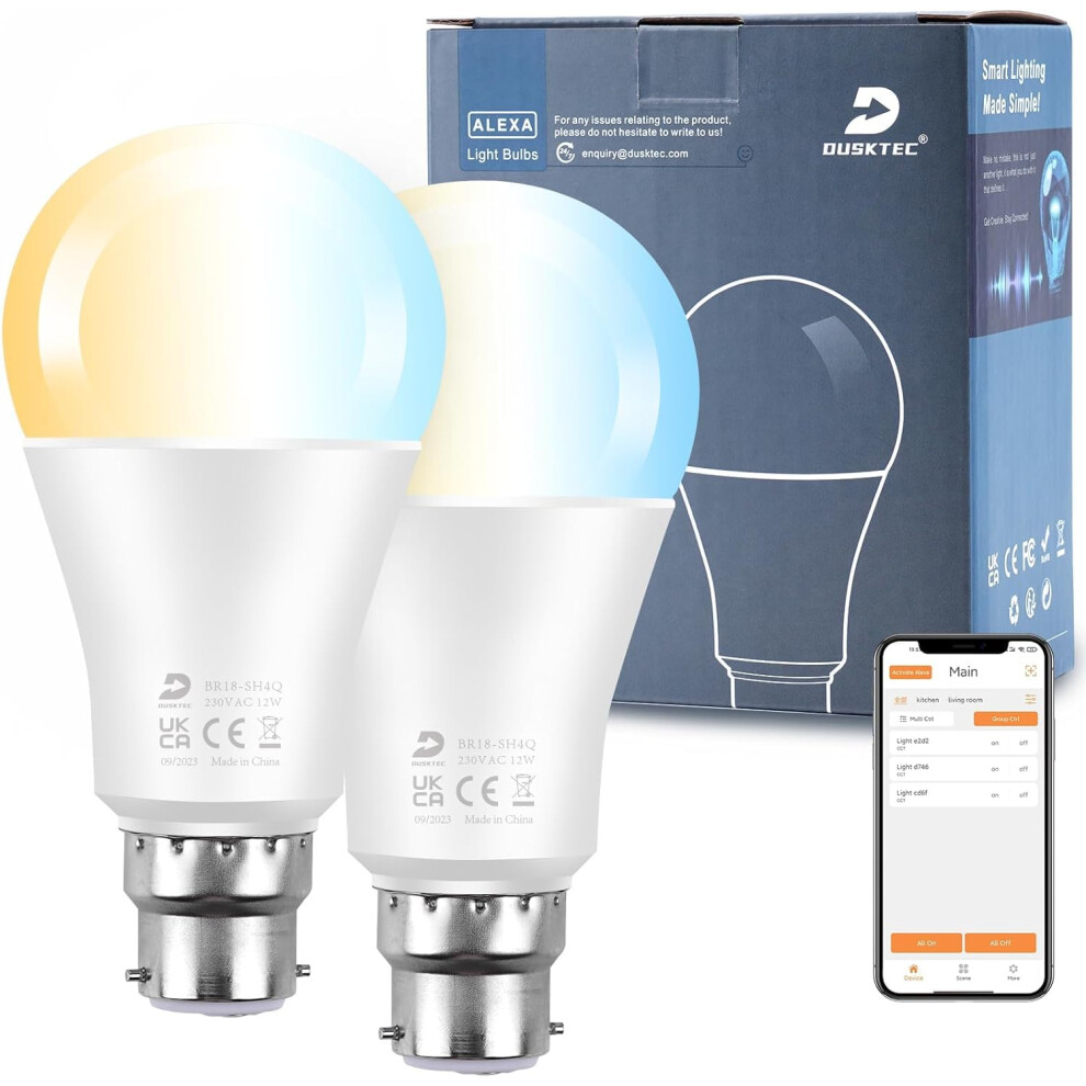 DUSKTEC Alexa Light Bulbs 2 Pack, 12W (130W Equivalent) Bayonet Light Bulbs CCT Dimmable, Bluetooth App Control 1300LM B22 Base LED Bulbs, A60 Energy
