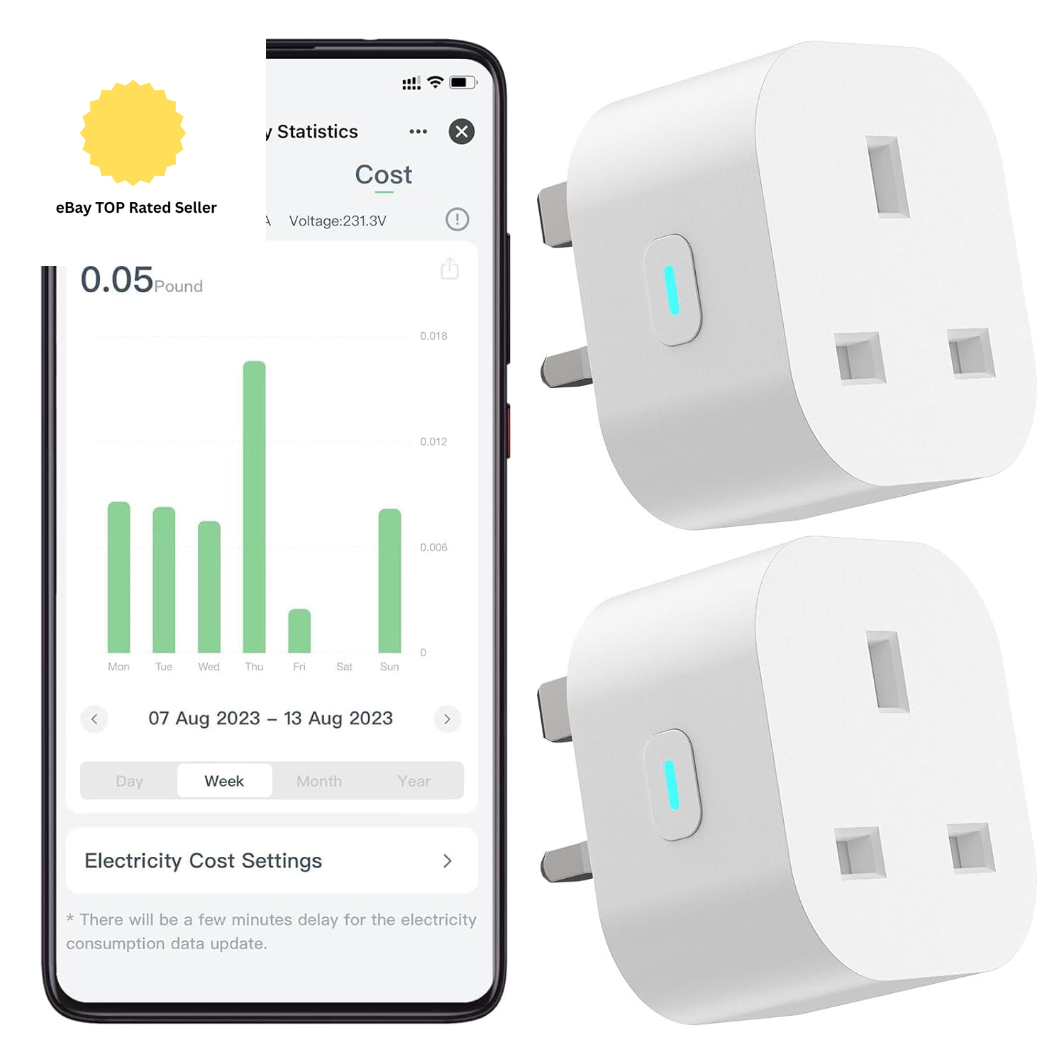 EIGHTREE Smart Plug with Energy Monitoring and Cost Estimation, Alexa Smart WiFi Plugs that Work with Alexa, Google Home and SmartThings, Smart Home Timer Plug Socket UK, 2.4GHz Wi-Fi Only, 13A, 1Pack