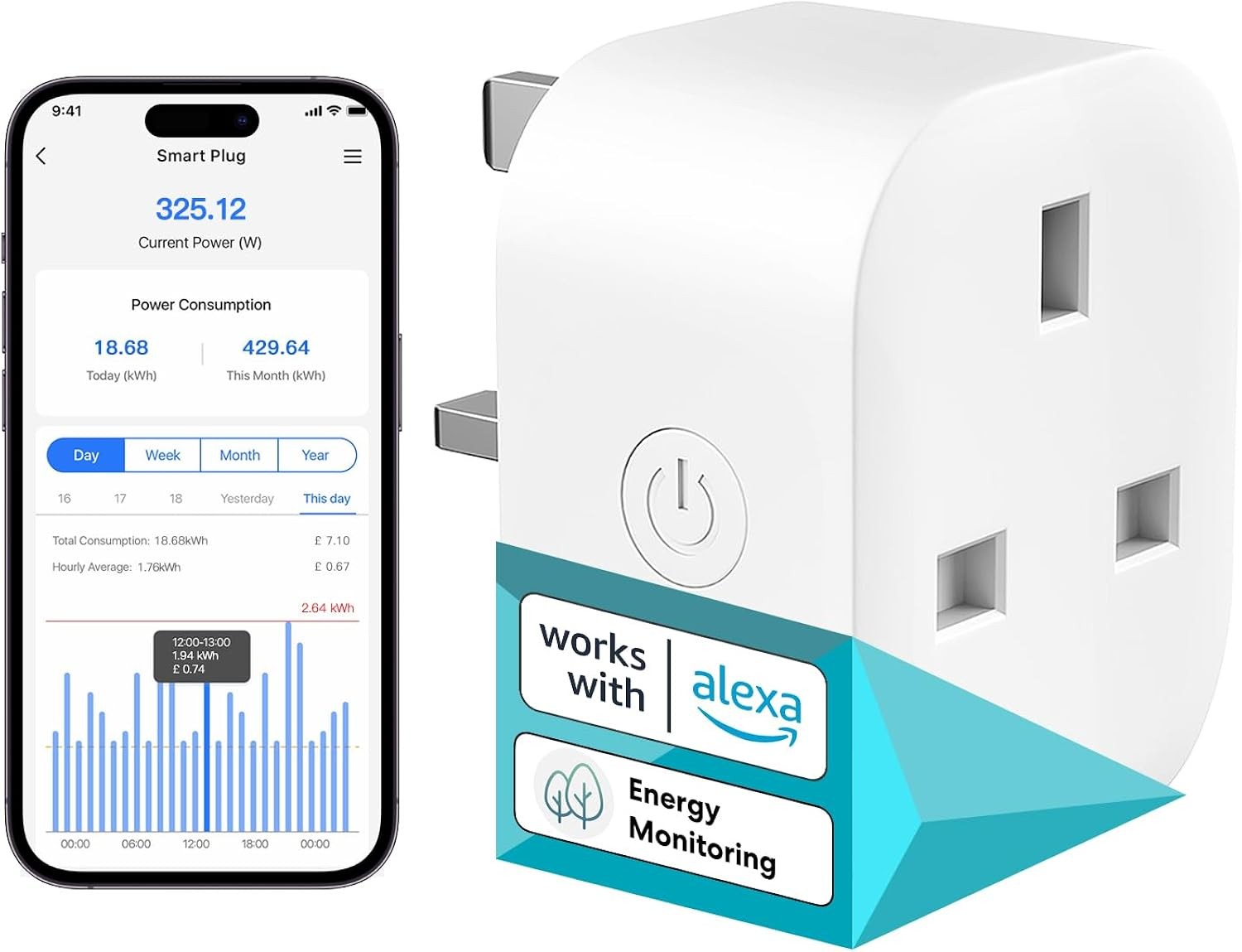 Smart Plug Wi-Fi Outlet, Works with Alexa & Google Home, Wireless Smart Socket with Energy Monitoring, Timer & App Remote Control, Device Sharing, 2.4GHz Wi-Fi Only, 13A (1 Pack)