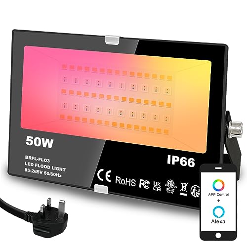 Mobri LED Floodlight Outdoor with Alexa, Smart Flood Lights Colour Changing APP Control, 50W 5000LM Bluetooth, Warm White+1600 Million RGB Colours, No WiFi No Hub, IP66 UK 3-Plug, 1 Pack