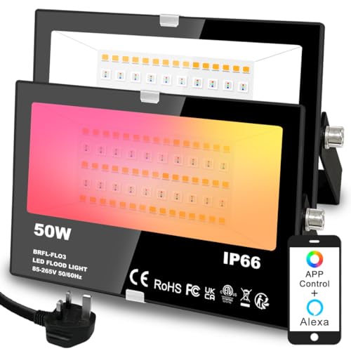 Mobri LED Floodlight Outdoor with Alexa, Smart Flood Lights Colour Changing APP Control, 50W 5000LM Bluetooth, Warm White+1600 Million RGB Colours, No WiFi No Hub, IP66 UK 3-Plug, 2 Pack