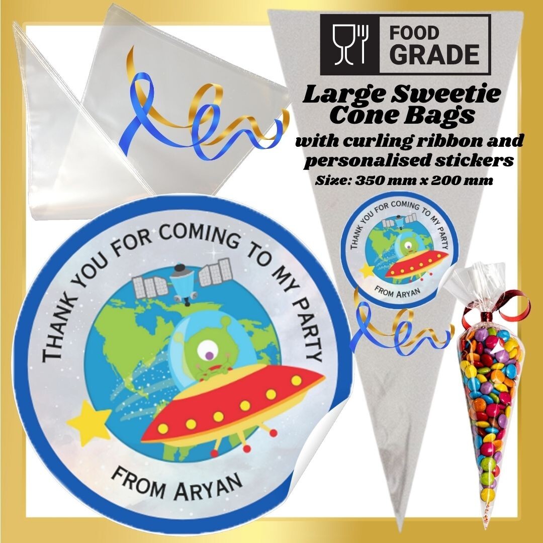 20 Space Alien DIY Personalised Sweet Cone Kit Party Bag Stickers Kit