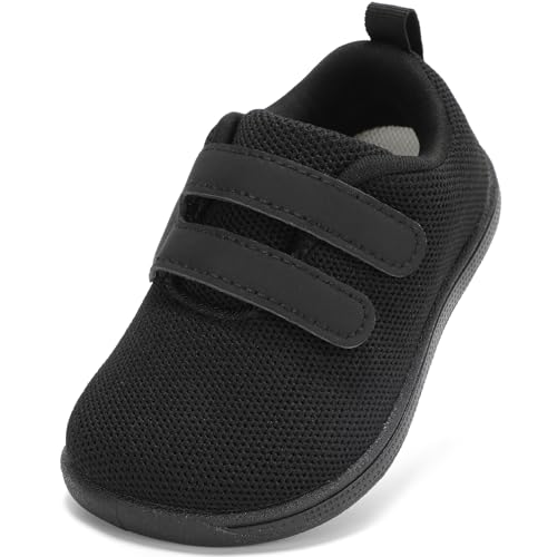 STQ KIDS Wide Fit Boys School Shoes Non Slip Toddler Barefoot Shoes Lightweight Kids Trainers for First Walk with Hook and Loop All Black UK 11 / L12