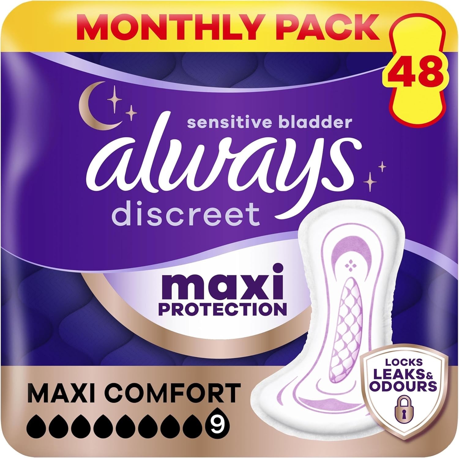 Always Discreet Incontinence Pads Women, Maxi Protection Secure Pads 48Pack