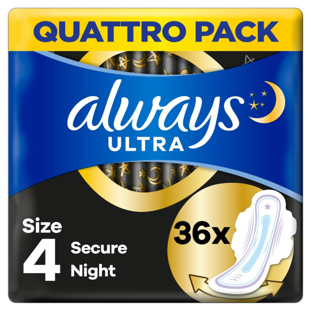 Always Ultra Night Secure Sleep Sanitary Extra Wings Size 4 Quattro Pack 36 Pads