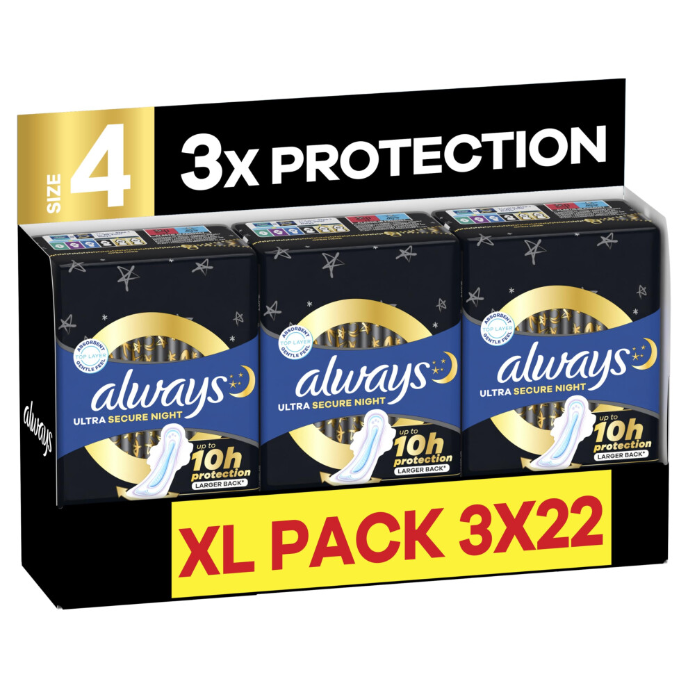Always Ultra Sanitary Towels, Size 4 Secure Night, Extra Large Pack, 66 Count, Super Absorbent, Ultra Thin Pads with Wings for Overnight Protection