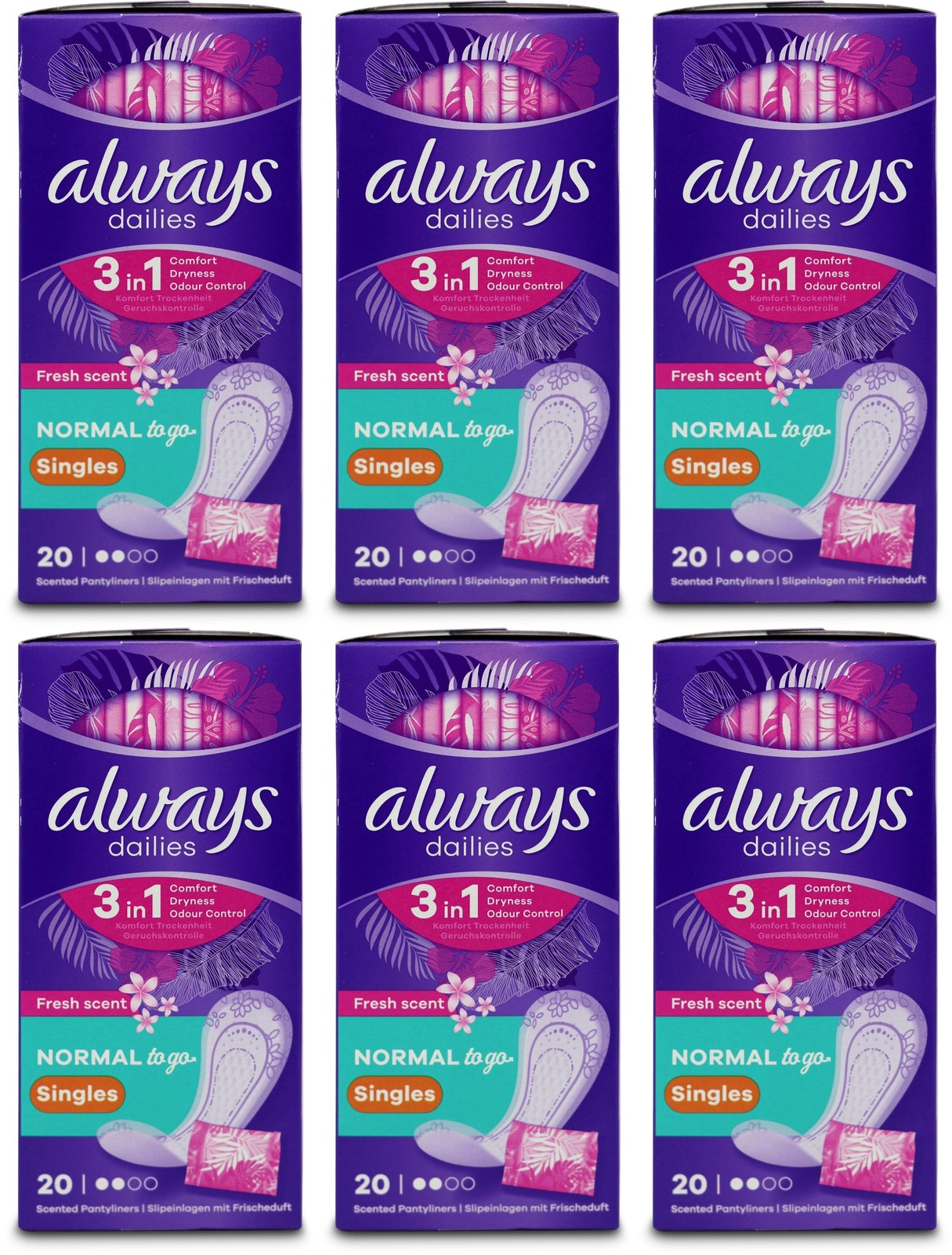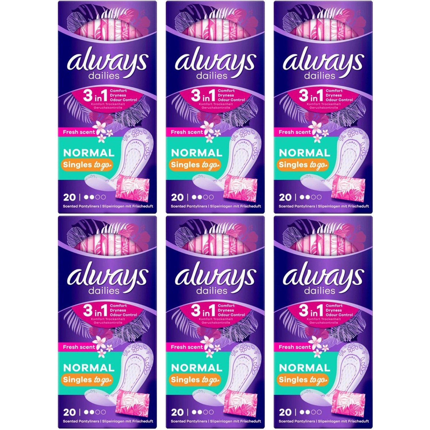 Always Dailies Singles Panty Liners Fresh Scent 20 Liners X 6