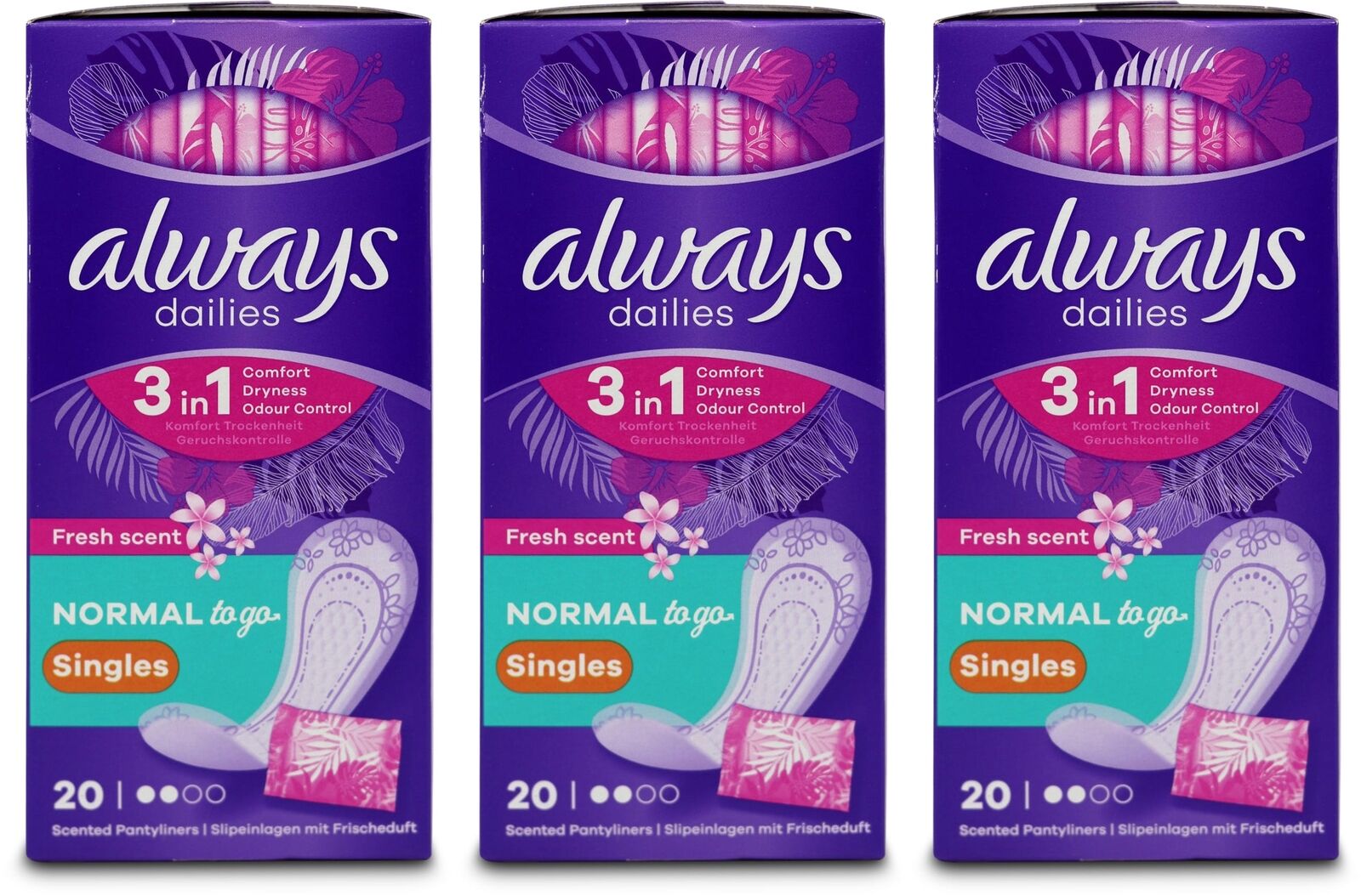 Always Dailies Singles Panty Liners Fresh Scent 20 Liners X 3