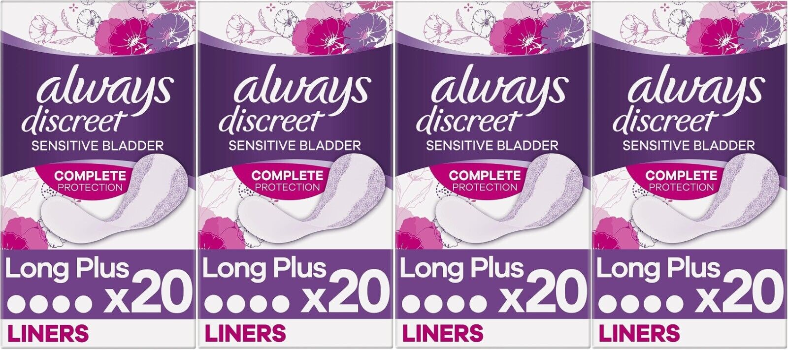 Always Discreet Incontinence Liners Women Long Plus 20 Panty Liners, (Pack of 4) Lock in Leaks and Odours, for Sensitive Bladder