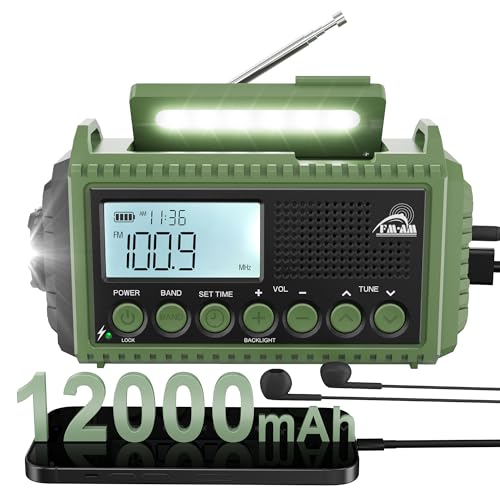 Portable Wind Up Hand Crank and Solar Powered Radio with USB Phone Charger, Emergency Radio with SOS Alarm and Flashlight, AM/FM/SW Radio with 12000mAh Rechargeable Battery for Outdoor