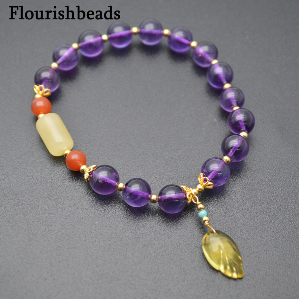 Natural Purple Amethyst and Amber Beads Charm Stretch Bracelet Fengshui Lucky Fine Jewelry