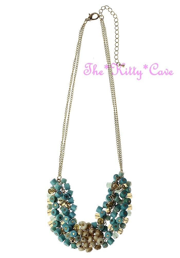 Chic Boho Turquoise Cream Amber & Mint Green Cluster Beads Matte Gold Necklace