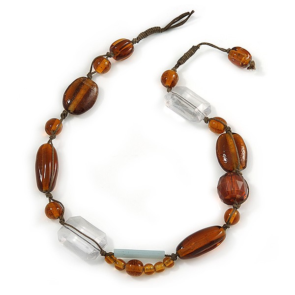 Transparent, Amber Brown Ceramic, Glass Beads Black Cord Necklace - 44cm L