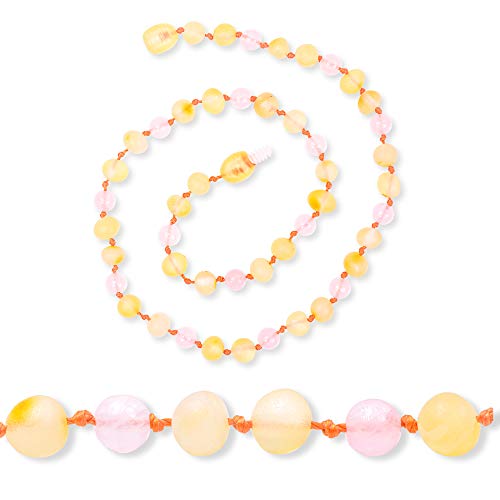 Genuine Baltic Amber Necklace - Raw not Polished Amber wit Rose Quartz Beads - Knotted Between Beads - Rose - 32 cm