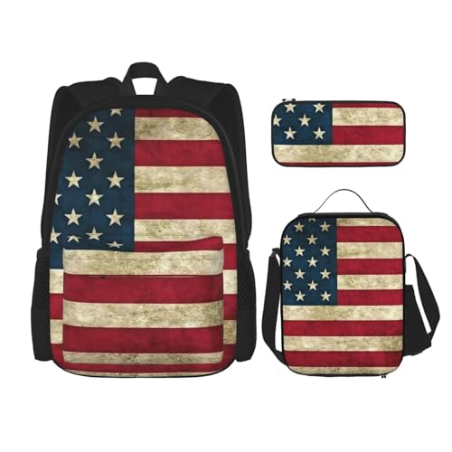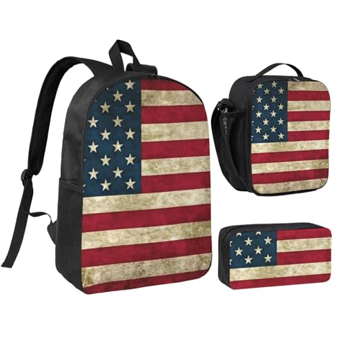 JBYJBX American Flag Print School Backpack Adjustable Shoulder Straps,Lunch Bag Pencil Case 3-In-1 Set Bag, Black, One Size