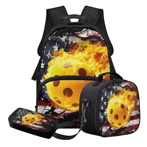 STUOARTE 3-in-1 Kids Schoolbag Set, Fire Pickleball Print School Backpack Set with Lunch Bag & Pencil Case, American Flag Printed Lightweight Casual Rucksack for Travel Camping