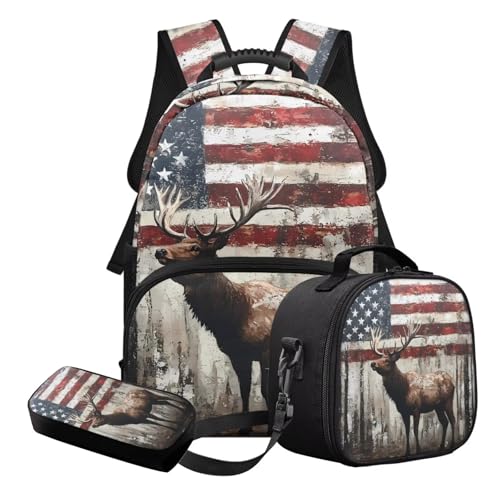 STUOARTE Deer American Flag Printed 3 in 1 Kids School Bag for Boys, Portable School Bookbag Set with Lunch Bag and Pencil Bag, Primary Middle Backpack 17 Inch Rucksack