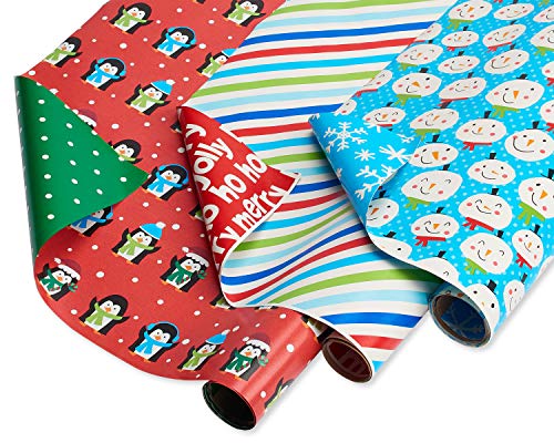 American Greetings 120 sq. ft. Reversible Kids Christmas Wrapping Paper Bundle, Stripes, Blue Snowmen and Red Penguins (3 Rolls Extra Wide 40 in. x 12 ft.)