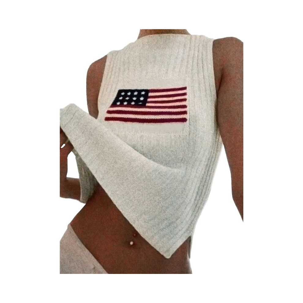 Women'S American Flag Sleeveless Sweater Vest Knit Crew Neck Tank Top Cream White L