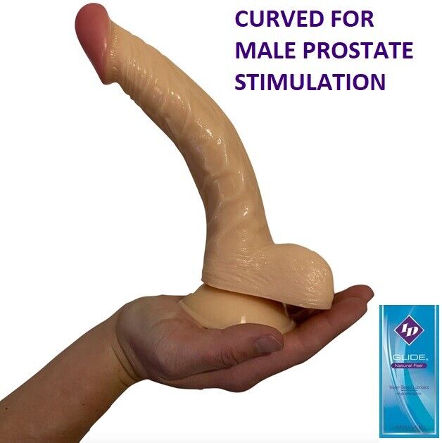 MALE PROSTATE ANAL DILDO 7.5 INCH Curved Slim Suction Cup & Balls Sex Toy Flesh