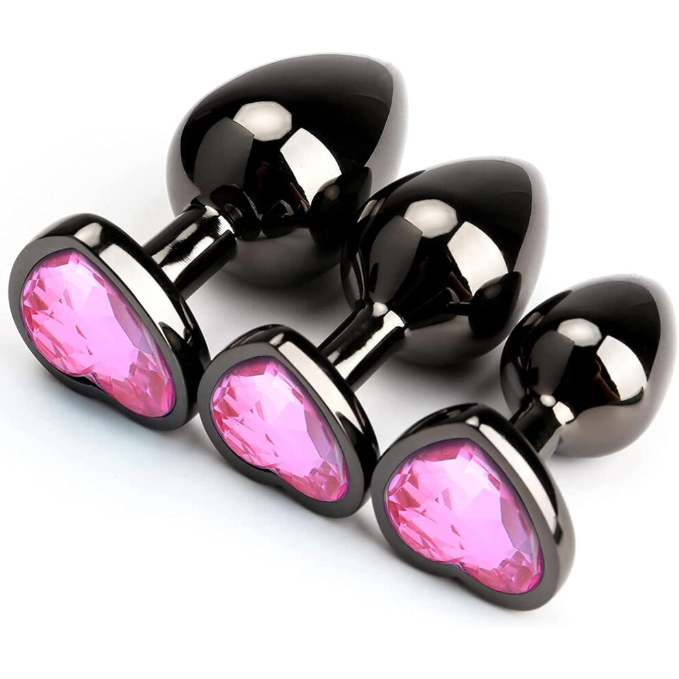 (Black) 3Pcs Luxury Metal Butt Toys Heart Shaped Anal Trainer Jewel Butt Plug Kits SM Adult Gay Anus Anal Plugs Woman Men