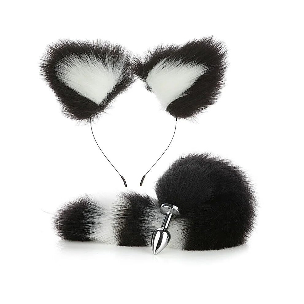 Anal Plug 2Piece Butt Plugs Fox Tail With Plush Ears Cosplay Long Tail Black For Women Couples