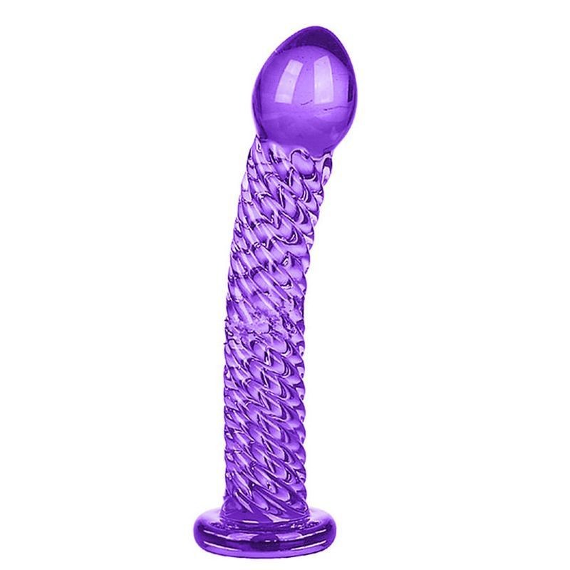 Purple Ribbed Textured Glass Vaginal and Anal Glass Dildo with Flat Handle Base