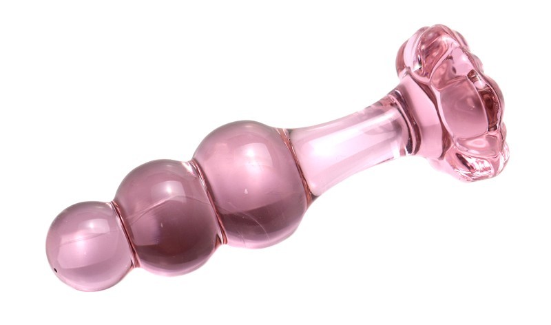 Beaded Glass Butt Plug - Anal Beads Dildo & Flared Flower Base Pink Ribbed Plug