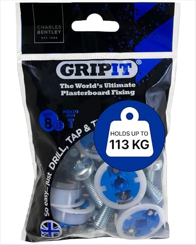 Gripit Blue Heavy-Duty Plasterboard Fixings - Reusable Drywall Fixings - Pack of 8 - Holds Up to 113kg - Easy to Install Drywall Anchor for TV, Stud Walls, Kitchen Units & Boilers – UK Designed