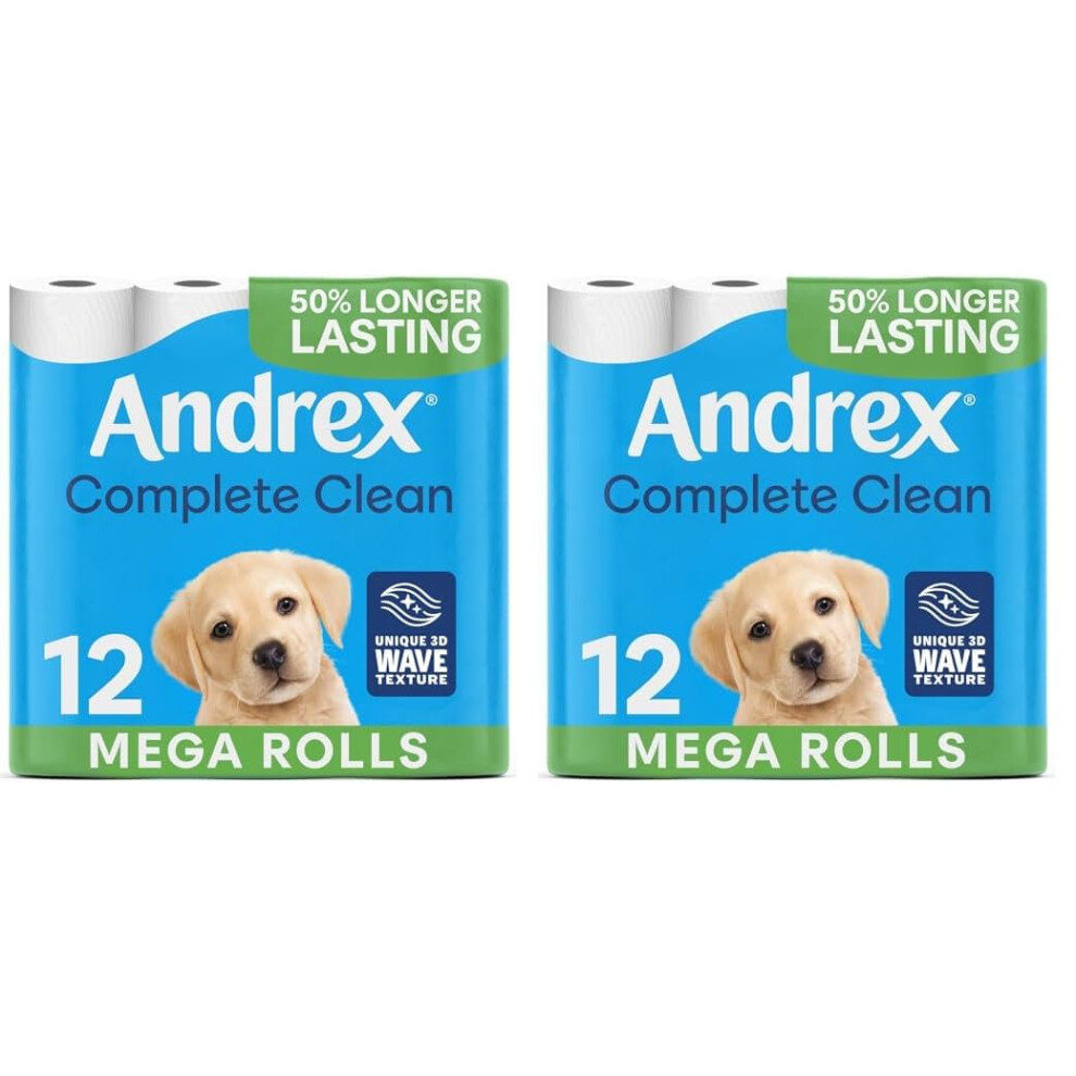 Andrex Complete Clean 12 Mega Toilet Rolls 18 Standard Toilet Rolls 50 Longer Lasting Paper with unique 3D Wave Texture for a Proven Effective Clean