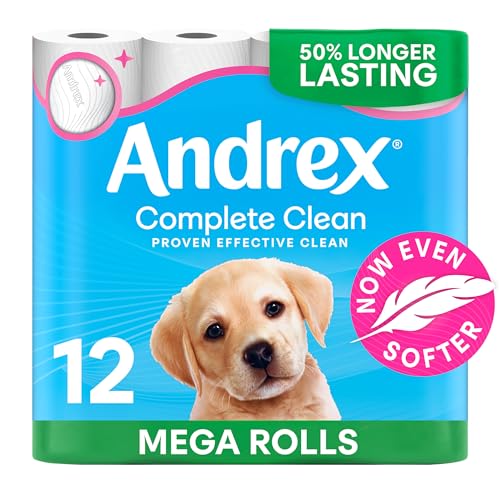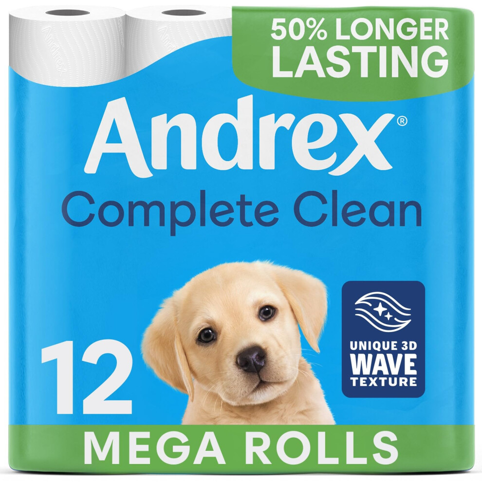 Andrex Complete Clean 12 Mega Toilet Rolls= 18 Standard Toilet Rolls, 50% Longer Lasting Paper with unique 3D Wave Texture for a Proven, Effective Clean, FSC Certified